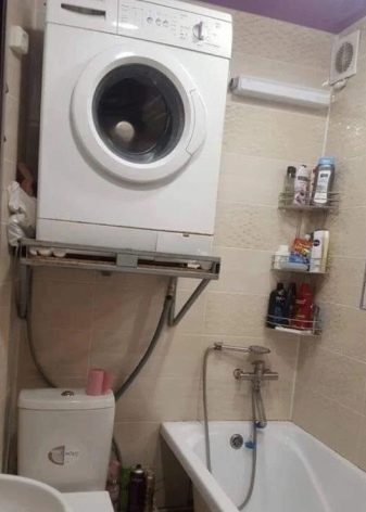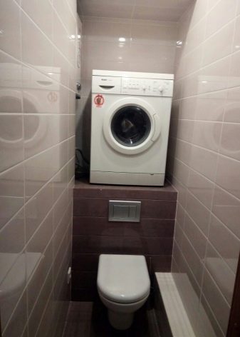 При успешно поставяне машината не пречи на влизането и излизането, не провокира травматични ситуации. Ако го настроите високо, по време на работа ще трябва да използвате стол или табуретка. А в тясна тоалетна това е проблематично. Например, особено трудно е да поставите табуретка близо до тоалетната, за да вземете или сложите бельо.