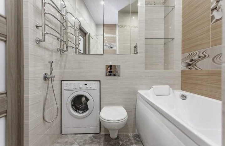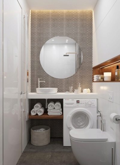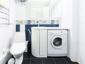 В компактна баня, комбинирана с тоалетна, може да се монтира пералня близо до вана или душ, под топла кърпа, бойлер. В този случай техниката може да бъде поставена между банята и тоалетната, както и срещу нея. Може да се постави на мястото на мивката. Като алтернатива може да се монтира под конзолен работен плот, като се използва останалото пространство под кошницата за пране..