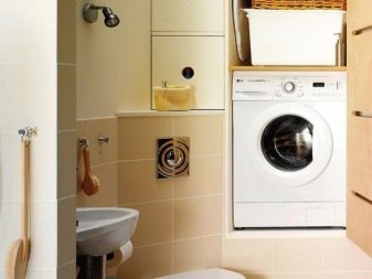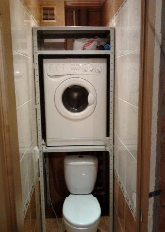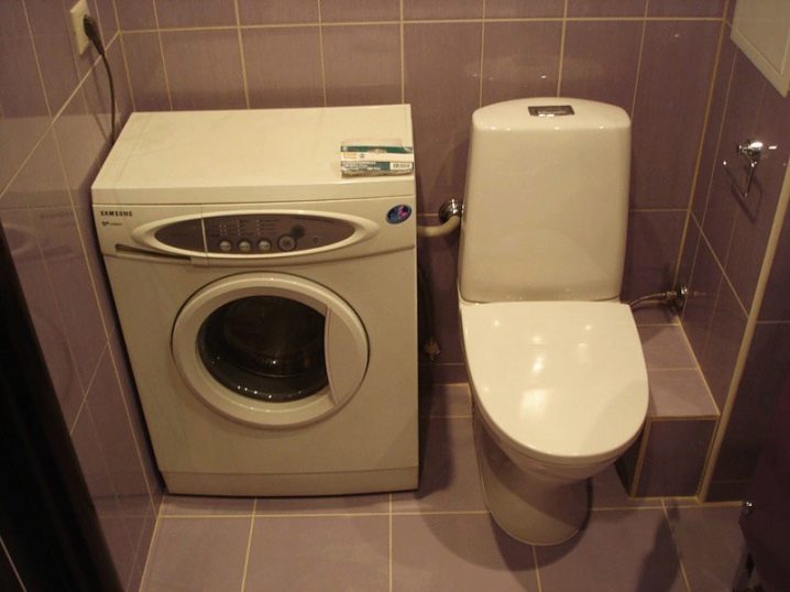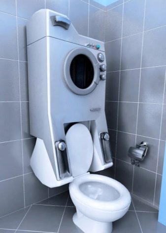 Инсталирането на пералнята в тоалетната може да бъде различно. Най -лошият вариант се счита за поставяне над тоалетната.. Дори и да не стърчи, ще бъде изключително неудобно да поставите и извадите прането. Освен това, нехигиенично е.
