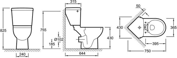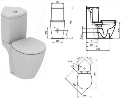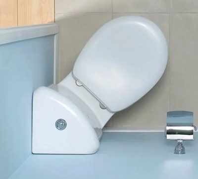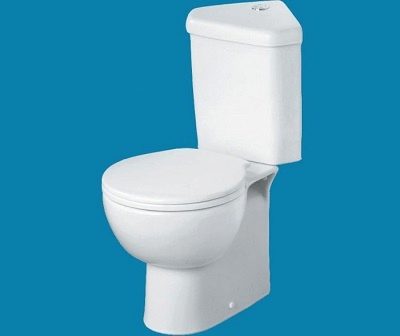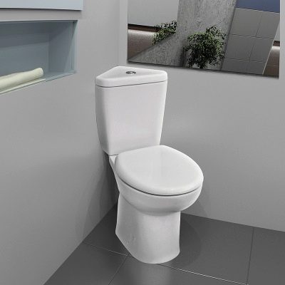 Обикновено ъглови тоалетни се използват за спестяване на място.. Често те се представят като моноблокове под формата на дизайн от дренажен резервоар и тоалетна чиния. Между предимства такъв модел – издръжливост и по -ниска цена. Често тези тоалетни са оборудвани със специална система, която при препълване на купата пренасочва водата към преливния канал.. Недостатък такъв моноблок е, че при най -малкия срив той ще трябва да бъде напълно променен. В модела, закачен на стена, казанчето и тоалетната са разделени, те могат да бъдат закупени отделно. В този случай резервоарите могат да се монтират директно в пространството на стената..