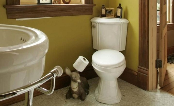 - По -добре е да допълвате класическия интериор с продукт с декор.. Ясните линии и благородните нюанси на светлите цветове също ще бъдат подходящи. Ако преместите тоалетната леко от стената, тогава можете да организирате място за малки предмети зад нея. Ако искате нещо оригинално, тогава можете да играете в контраст. Например, поставете черна версия на тоалетната в снежнобяла баня. Освен това е възможно интересно разположение на тоалетната чиния успоредно на стената. Не бива да се отказвате от ярки модели, които могат да бъдат чудесен акцент в банята..