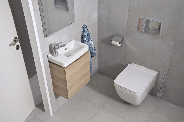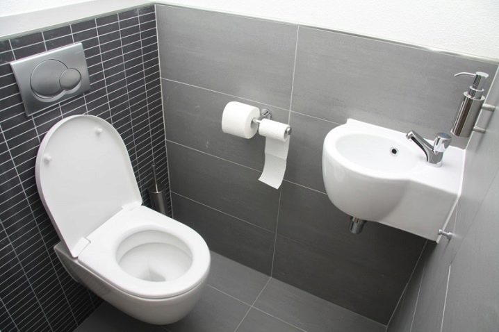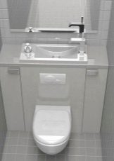 В някои случаи мивката е инсталирана над самата тоалетна. Обикновено минималният размер на модела тип висулка е подходящ за такива цели. Решението е смело, но ви позволява да спестите по -ефективно и без това скромната площ на стаята.