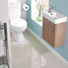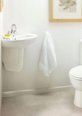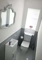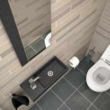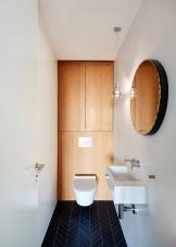 - За дизайна на тоалетна с малки размери се препоръчва да изберете както финала, така и водопровода, проектирани в светли цветове.. Ако оформлението на стаята позволява, инсталирайте тоалетна чиния по протежение на една от дългите стени, а от дясната страна на нея поставете тесен умивалник върху висящ снежнобял шкаф с подобни тесни затворени рафтове. Интериорът ще се окаже минималистичен, но ергономичен и функционален.