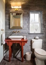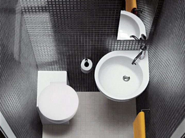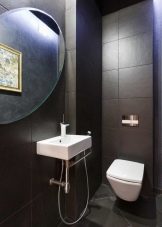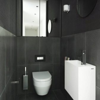 - В много малка тоалетна, чиито стени са завършени с лъскави черни мозаечни плочки, е възможно да се монтира окачена на стената ъглова мивка с идеално кръгла купа. Малка тоалетна ще намери своето място в ъгъла отсреща. Желателно е водопроводът да има контрастен бял цвят. Много лесно се разреждат черно -бели бои – закачете жълта кърпа върху хром държач в тоалетната.