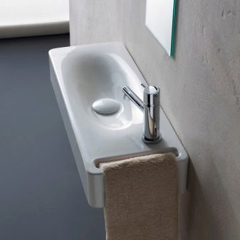 Ако квадратните метри в тоалетната позволяват, можете да разгледате по-отблизо мини мивки, допълнени със странични маси.. Последният играе ролята не само на поддръжка за купата на умивалника, но и маскира всички комуникации, които са свързани към уреда. Домакинствата могат да съхраняват много различни неща в нощно шкафче, например кърпи, домакински химикали, козметика. В някои модели пиедестали има допълнителни чекмеджета, в които можете удобно да поставите още повече предмети, което е много удобно.