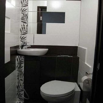- Интересно ще изглежда тоалетна, направена в комбинация от черно -бели плочки.. Зад ъгловия тоалет си струва да се изгради отделна конструкция, наподобяваща бордюр, но изработена от строителни материали, обшита с черни плочки. Именно върху тази конструкция трябва да се постави малка тясна черупка. Над последното можете да окачите голямо огледало с оригиналната форма. Интериорът ще се окаже по -оживен и привлекателен, ако обикновените стенни плочки се допълнят с малки вложки с растителни щампи..