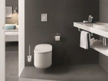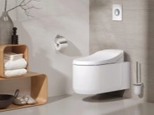 - Grohe Sensia Arena 39354SH0. Комплект тоалетни и биде, произведени в Германия. Оборудван с овална порцеланова купа и капак на седалката от дуропласт. Изходът е хоризонтален, а измиването е кръгло. Има автоматичен микролифт, 2 душ ръкави, 1 от които е предназначен за дами. Оборудването включва също проточен нагревател, сешоар и филтриращ компонент. Резервоарът и инсталацията трябва да бъдат закупени отделно..