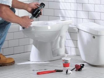 - Сега можете да прикрепите устройството към пода, като пробиете дупки по маркираните точки. За да направите това, използвайте перфоратор. В направените отвори трябва да поставите специални щепсели. Фиксирайте тоалетната на мястото й, така че съществуващите дупки да се сближат. След това затегнете гумените болтове. Скрийте крепежните елементи зад декоративните тапи.