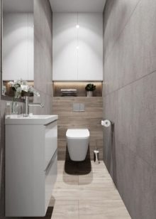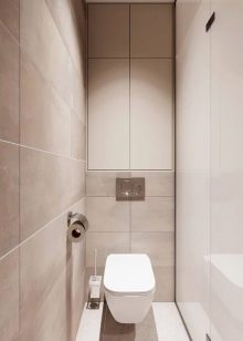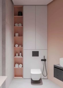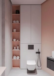 Нишите в тоалетната зад тоалетната сякаш са проектирани да бъдат запълнени с мебели.. Допълнителното пространство, предоставено от строителите, ви позволява да правите рафтове до дълбочината на цялата ниша, колкото и обемна да е тя, но в същото време шкафът не изглежда масивен. Интериорът на стаята може да бъде подобрен с красиви фасади или врати на шкафове, които да съответстват на тапета и да създадат илюзията за стена.