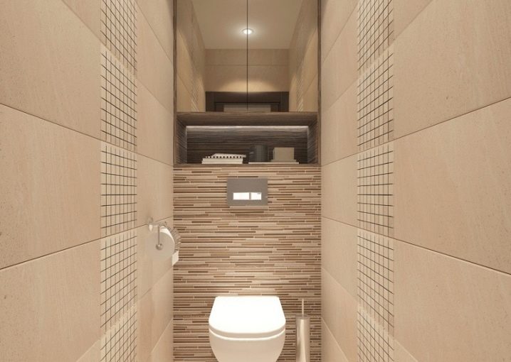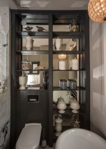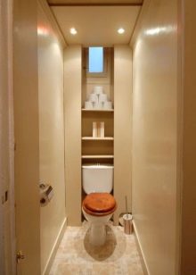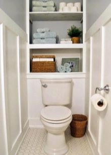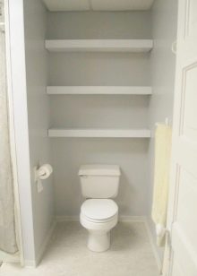Мога купувайте готови мебели и ги вградете в ниша, но е изключително трудно да се намери продукт с идеалния размер (и дори да се постави зад тоалетната). Следователно, пространството се запълва самостоятелно с рафтове или те правят шкаф по поръчка, като вземат предвид всеки сантиметър от използваемата площ..