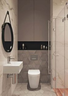 Просторен помещенията са оборудвани с цели комплекти мебели, включително подов шкаф над тоалетната. V малък в баните е по -практично да се монтират конструкции от стена до стена и да се издигат до самия таван.