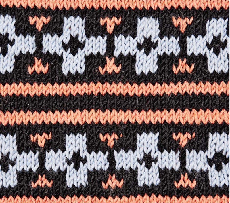 Prvým vzorom v kolekcii je dvojfarebný lenivý žakárový vzor s retiazkami, ktorý môžete použiť ako lem na dokončenie úpletov alebo na pletenie základného vzoru, ak