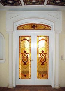 Прекрасно – добавяне на отделни парчета стъкло към основното остъкляване. Това ще помогне да се подчертае оригиналността, без да се зарежда вратата. Кристалите, кристалите, чантата ще привлекат вниманието с играта на ръбове, ще направят платното по -изящно, но с нотка на лекота.