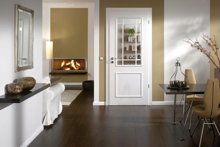 При създаване на хармоничен интериор Препоръчително е да изберете цвят и модел на входните конструкции, подобно на подовата настилка. Контрастната комбинация от цвета на вратите и пода ще бъде подходяща само в голяма стая в комбинация с палитра от мебели и стени, первази и дъски.