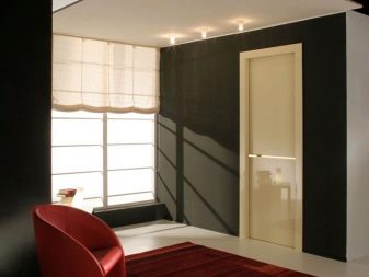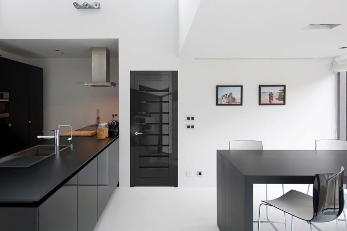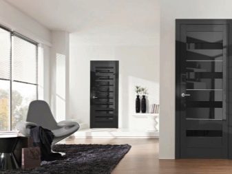 Черните врати се вписват добре в модерния стил на стаите, хай-тек, модерен. Тази опция придава известна изтънченост и се фокусира върху яснотата на линиите. Гланцът изглежда страхотно в стая с обикновен тапет. Можете да опитате изискана черно -бяла опция за дизайн с врати в контрастен цвят..