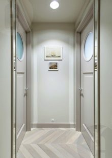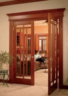 Ако повечето от стаите на къщата са направени в класически стил, тогава е по-добре да изберете по-лек двулистов модел с прозрачни стъклени вложки, които имитират прозорци. Такава врата ще изглежда свежа и елегантна. Освен това, поради неутралността си, той никога няма да привлече вниманието към себе си от основните интериорни детайли..
