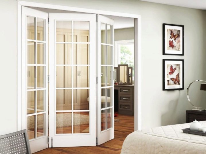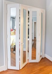 - Интересен вариант е вратата на акордеона. Този дизайн е много по -рядко срещан, но все пак може да се намери в някои домове. Обикновено акордеоните нямат стъклени вложки, но такива модели се появиха наскоро. Трябва да кажа, че много хора се влюбиха в своята оригиналност..