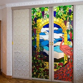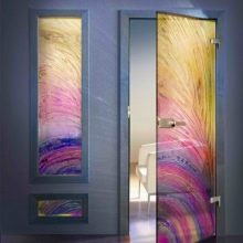Ярките врати от витражи ще се впишат по -добре в стаи, направени в модерни стилове. Основното е, че цветовата гама на стъклената мозайка напълно съответства на цветовата схема на интериора. Трябва да се отбележи, че в класически интериор такива опции в повечето случаи ще изглеждат неудобно..