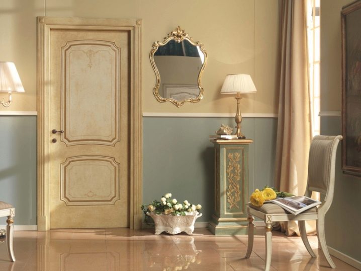 Отличен декоративен елемент – портали, декоративни дъски с резбовани елементи. Вратите често са украсени с патина, напръсквайки платното със златиста или сребърна боя. Патинирането е изкуственото стареене на мебелни елементи или спално бельо и изглежда особено добре в класически и селски формат. Прованс е идеален за това описание..