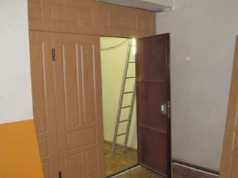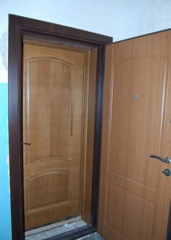 - На части. Използва се, ако трябва да добавите платно към съществуващо или ако вратите са изработени от различни материали. За да монтирате втората входна врата по този начин, е необходимо да сглобите кутията, да окачите платното върху нея и да поставите тази конструкция във вратата на нивото, да я запечатате. Предпоставка – платната на вратите трябва да са със същия размер.