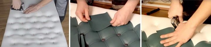 - За възстановяване на продукт с изкуствена кожа или винилова кожа трябва да се използва само лепило. За това ръбовете на конструкцията се смазват с лепило и към тях се прикрепват ленти от пяна. Излишните части могат да бъдат отрязани със специален нож. След това краят на горната част на вратата се смазва с лепило и тапицерията се залепва, започвайки отгоре. По време на работа не забравяйте да изгладите платното, за да избегнете образуването на бръчки..