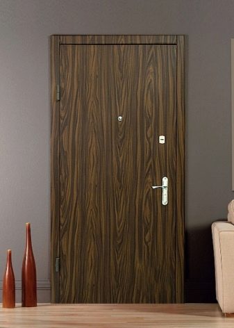 - Довършителен ламинат използва се, когато искате да постигнете вида на естествено масивно дърво, но това не е възможно. Този материал може да имитира масивен дъб, бор, кедър и други дървесни видове. Работата с нея е лесна, но най -добре е да я използвате само за украса на вътрешната страна на вратата, тъй като тя се разслоява под въздействието на влага.