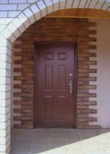 - Изкуствен камък се произвежда в тънки панели, които са фиксирани от външната страна на вратата с помощта на строителна смола. Конструкцията, облицована с камък, изглежда много впечатляваща.