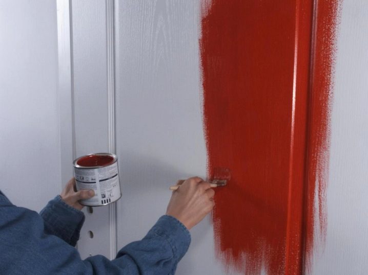 Това е най -икономичният вариант за декориране на конструкция на врата. В съвременния свят е доста лесно да се намери подходящ тон, защото има много различни нюанси, произведени от много известни компании. Освен това е възможно да се получи идеалният цвят чрез смесване на състава на багрилото с цветовата схема, като се спазват определени пропорции.