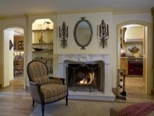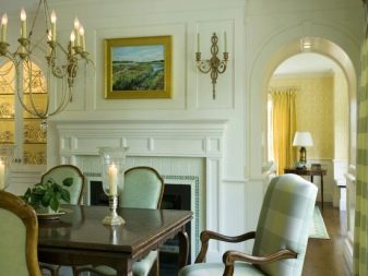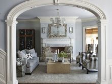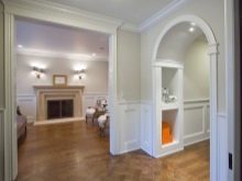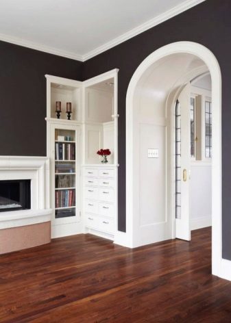 Обикновена арка, направена в контрастен цвят, може да зададе тона за цялата настройка. Тя често е настроена така, че да съответства на останалата част от стаята. В този случай всички елементи са в добро съгласие помежду си: цокли, арка, шкафове, камина. Облицовката на външния ръб на конструкцията повтаря простия геометричен модел на таванните цокли, като по този начин стаята става едно цяло.