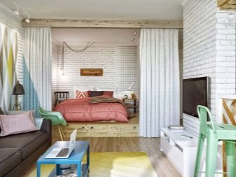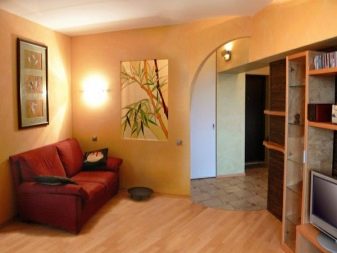 В случаите, когато такъв малък апартамент има ниски тавани, е по -добре да не избирате дъгообразна форма като отвор. Много по -логично е да се спрете на класическия правоъгълен участък..