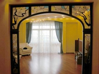 В този случай фалшивата арка е пресъздадена с помощта на дървени рамки и витражи. Дизайнът помага да се разшири още повече стаята, тъй като стъклените вложки не се подсъзнателно разглеждат като алтернатива на стените. Моля, обърнете внимание, че отворът на прозореца е направен в подобна форма, но именно входът в стаята е фокусът на цялата композиция..