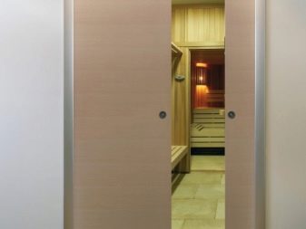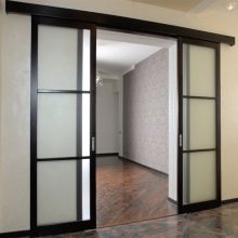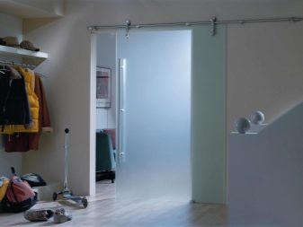 Такива модели са изработени в модерен стил, предимно от стъкло и метал. Закрепването на плъзгащи механизми в този случай не е скрито. Напротив, това е интересен дизайнерски елемент, който украсява вратата..