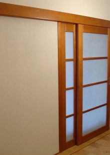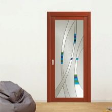 - Стъкло, огледало. Стъклените врати в алуминиева рамка изглеждат елегантни и много впечатляващи. Това може да бъде обикновено прозрачно стъкло, матирано платно с шарка, витражи или дори огледална повърхност. Такива врати струват малко по -малко от дървените, макар и не прекалено евтини. Те също са монтирани на две релси поради значителното им тегло.