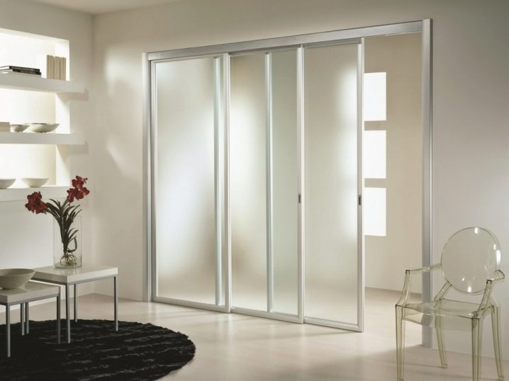 В малка стая можете да инсталирате платно с голямо огледало. Този атрибут визуално ще увеличи стаята. Стъклени продукти могат да разширят пространството. Дизайнът на такива модели обаче се различава от другите: когато вратата се отвори, прибиращият се механизъм се скрива в ниша за стена, подготвена предварително за това. Стъклото може да бъде матирано, да има витражна текстура, различни шарки и цветове.