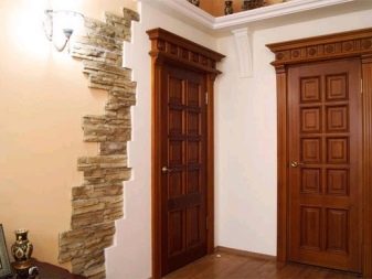 - За хола ще направи масивна врата, която представя къщата, правейки впечатление на гостите. За да изглежда интериорът солиден и представителен, се използват наслоения, подобни на дърво. Те се поставят не само на вратата, но и на съседни участъци от стената..