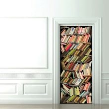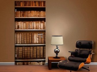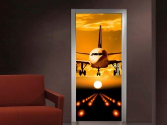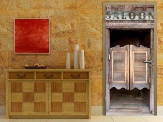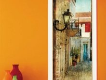 За крило на вратата използването на тапети с вертикален модел или с текстура на дърво ще бъде оптимално. По -добре е да закупите плътно платно 86×220. Чертежът е избран според вкуса или за общия стил на интериора.