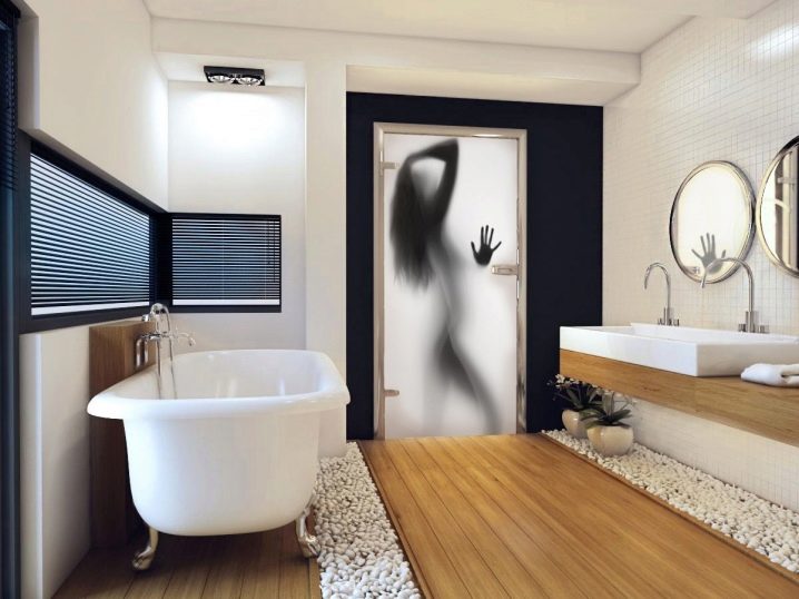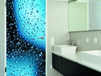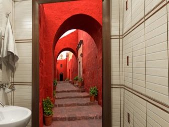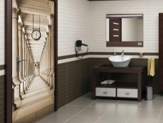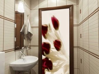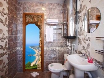 Ефективно и евтино можете също да украсите вратите на банята с фототапети. Само в този случай, устойчиви на влага, здрави тапети на винилова основа с противогъбично импрегниране. Темата може да бъде много разнообразна: обитателите на океанските дълбини, морски растения, плажове със сърф, платноходка или буря в морето. Триизмерните триизмерни изображения изглеждат оригинални и модерни, хвърляйки поглед към друга реалност.