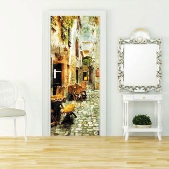 Можете също така да украсите входната врата с фото декор. Но предпоставка е използването на материал, устойчив на повреди и влага. Непрекъснатото платно с желания декор не само ще зарадва окото, но и ще придаде на дома уважаван вид от самия праг.