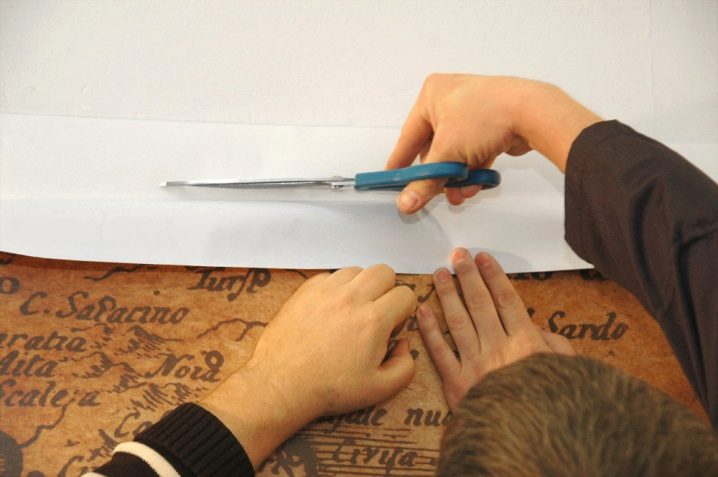 Когато залепите интериорна врата с фототапет, излишъкът се отрязва с остър канцеларски нож. Първо трябва да оставите малко поле за завоя.