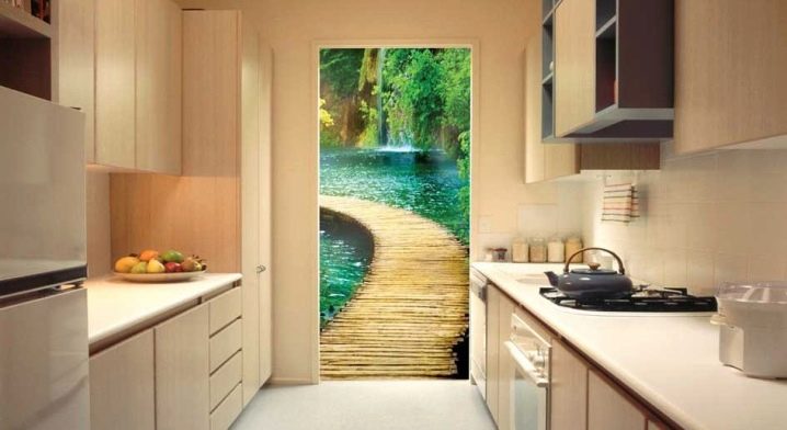 За кухненската врата тапетът е подходящ с различни теми, винил или гладък. Но не само на хартиена основа, но със защитно покритие, което не се страхува от влага, изпарения и избледняване.
