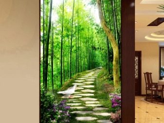 Текстура на платно ще изглежда страхотно на двойна люлееща се врата в хола, което може да се каже за ленената структура на фототапета. Пейзажи, натюрморти, природа във всичките й проявления изглеждат красиви и уважавани върху тях. Често такива панели са допълнително рамкирани, подчертавайки с корнизи, за да направят вратите основния акцент в стаята..