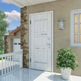 - Моделите “Arktika” се отличават с повишена топлоизолация. Принципът на производство на тази врата е сандвич панел. Това означава, че платното има не един слой, а няколко. Извън вратата има 2 стоманени слоя, между тях има MDF и пенофол. Това осигурява отлична топлоизолация. Металните части са покрити със специална прахова боя, която предпазва вратата от образуване на лед при тежки студове.