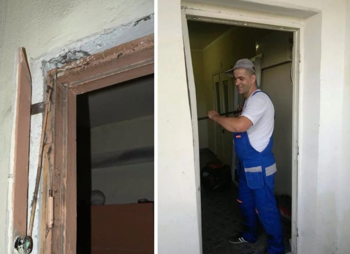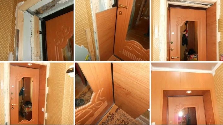 За да се придаде на вратата по -естетичен вид, старите склонове трябва да бъдат завършени по същия принцип като платното. За това се правят измервания на техните размери и за тях се подготвя основа. Идеалното довършване на такива части е дървени летви. За да скриете шева между ламинатните панели, можете да направите 45-градусови разрези. Наклоните трябва да бъдат начертани от двете страни на вратата.
