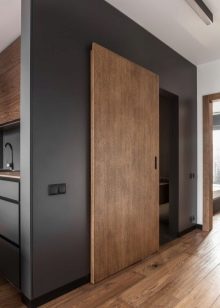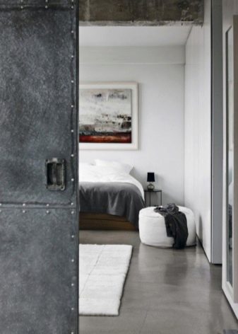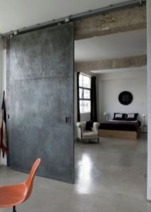 Широка плъзгаща се врата, изработена от метални листове, изглежда много необичайна във вътрешността на стаята, придавайки й вид на склад.