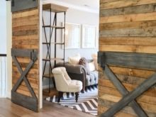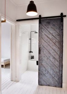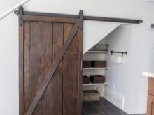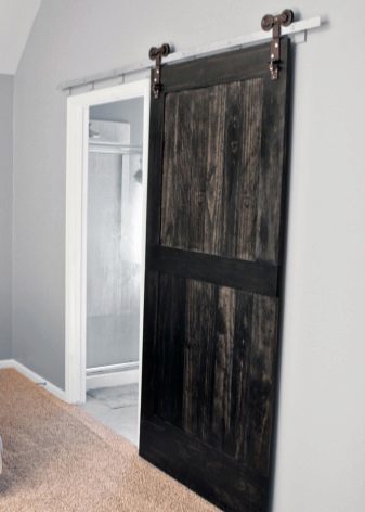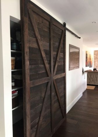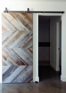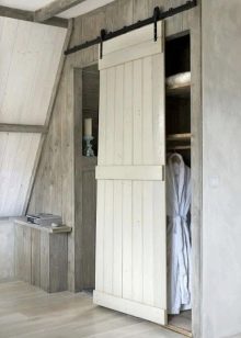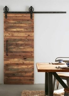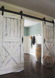 Най -често срещаният вариант за производство на конструкции на плевня е закрепването на груби вертикални (надлъжни) дъски заедно (отгоре и отдолу) с две напречни дъски. В повечето случаи тези модели претърпяват изкуствено стареене на повърхността, което придава на интериора с такива структури особен чар. За такива врати най -често се използват големи метални дръжки, които могат да се поставят както хоризонтално, така и вертикално..
