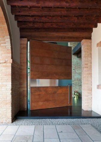 В допълнение към естетическата си привлекателност, входната врата трябва да има добри защитни свойства. Поради тази причина металните входни конструкции са много популярни. Допуска се монтаж на масивни дървени врати. Нарушената текстура и неравностите на дървото придават на продукта особена привлекателност и оригиналност..