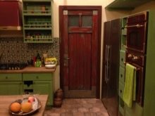 Дърпаво бургундско дървено платно създава поразителен контраст с кухненските мебели в зелени тонове.
