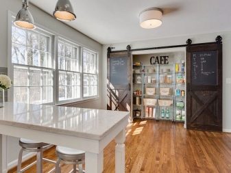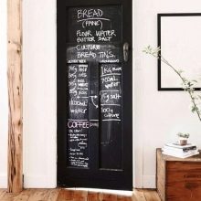 - Плъзгащите се врати за плевня набират огромна популярност напоследък. Декорирането на такива врати в кухнята с помощта на дъски с тебешир се оказа много успешна находка. Тази опция е ярък пример за комбинация от практичност и оригиналност..
