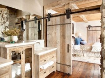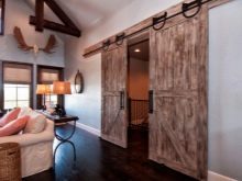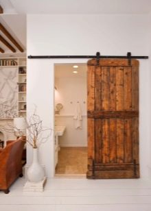 - Селски атрибут. За производството на такава врата е необходимо грубо изсечено платно. Такъв външен вид перфектно ще се впише в стаи, направени в стила на минимализма или апартаменти, където има ясно изразени детайли и преобладават бели тонове..