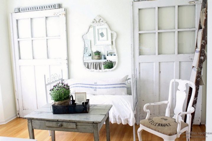 В апартамент с атмосфера на провансалски или скандинавски интериорен стил, възстановяването на вратите също е декоративно. Завършването с включване на патина и боядисване ще превърне обикновената стара бяла врата в стилен елемент на декора. Наличието на рамки и напречни щанги характеризира сглобяемата интериорна врата, която се нарича още панелна. Например, панелите могат да бъдат под формата на MDF листове или стъклени вложки. Така че е възможно да се създадат къдрави елементи и да се направи външният вид на платното доста интересен. Възстановяването на панелни врати означава запазване на съществуващите релефи или пълна подмяна на повърхността на продукта..